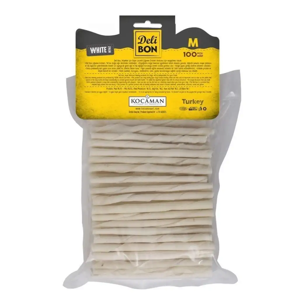Delibon Orta Boy Beyaz Deri Burgu Çubuk (100 Adet), dostunuzun hem çiğneme içgüdüsünü tatmin eden hem de ağız sağlığını destekleyen %100 doğal bir ödül mamasıdır.